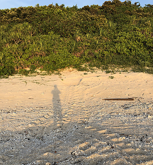 黒島研究所は、西の浜の他に西表島南岸にあるウブ浜とサザレ浜のモニタリングも実施しています。これらの浜は、八重山諸島でも屈指のアオウミガメの産卵地として知られています。産卵シーズンには、数メートルおきにウミガメの上陸痕跡がみられます。