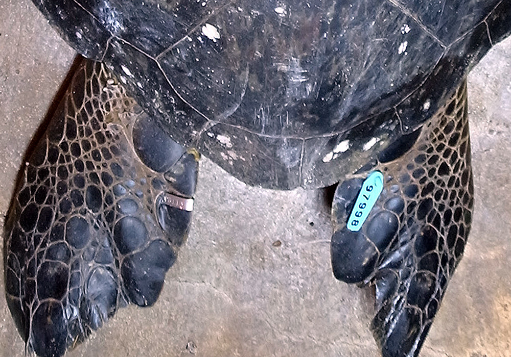ウミガメに個体識別用の標識をつけて海へ放流します。次に見つかれば、ウミガメの成長や移動ルートが明らかになります。この調査によって、八重山諸島は未成熟のアオウミガメの餌場になっていること、アオウミガメは一年間およそ2㎝大きくなることがわかりました。また、八重山だけでなく、本州や海外でも再発見されました。