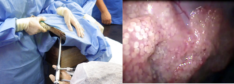 未成熟のウミガメは外見から性別がわからない。このため内視鏡によって直接 精巣か卵巣かを確認しオス・メスを判別する。画像は卵巣。