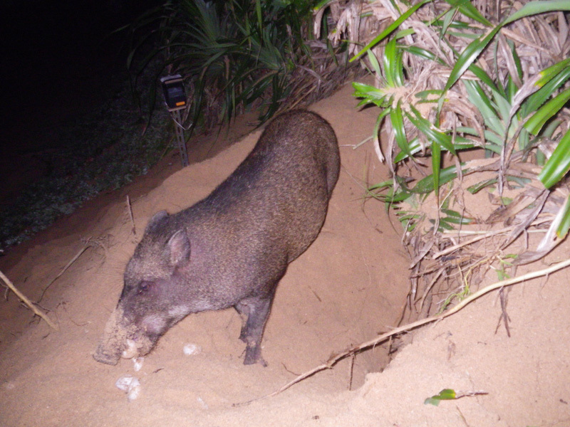 2008年に突如としてリュウキュウイノシシがウミガメ卵を食べ始めました。在来のイノシシがウミガメ卵を食べるのは、とても珍しい行動です。2010年に新聞に載せたところ大きな反響がありました。そして、イノシシを駆除するべきという話もありました。しかし、リュウキュウイノシシは琉球列島の固有種です。しかも、他島では豚との混血が進む中で、西表島のイノシシは純血を保っている貴重な個体群です。我々としては、イノシシを悪者にせず、自然のままに任せることにしています。