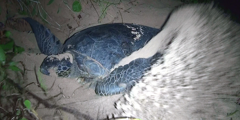 貴重なアカウミガメの交尾メスの繁殖である砂浜での産卵行動に比べ、オスとメスとの交尾はほとんど知られていません。そもそも、観察することがとても難しいです。例えば、日本において野外でのアカウミガメの交尾は、今までに数例しか報告されていません。アオウミガメの交尾は、アカよりも観察例が多いのですが、それでもフィールドで交尾を見つけることは困難です。数少ない情報から、産卵シーズンの初期に、産卵する砂浜の周囲で交尾すると考えられています。また、オスと交尾したメスは交尾の100日以上後でも受精した卵を産むことができます。しかし、メスの体内の何処に精子が貯蔵されているのか、どのようにして数ケ月も精子を生きた状態で残せるのか、まだわかっていません。