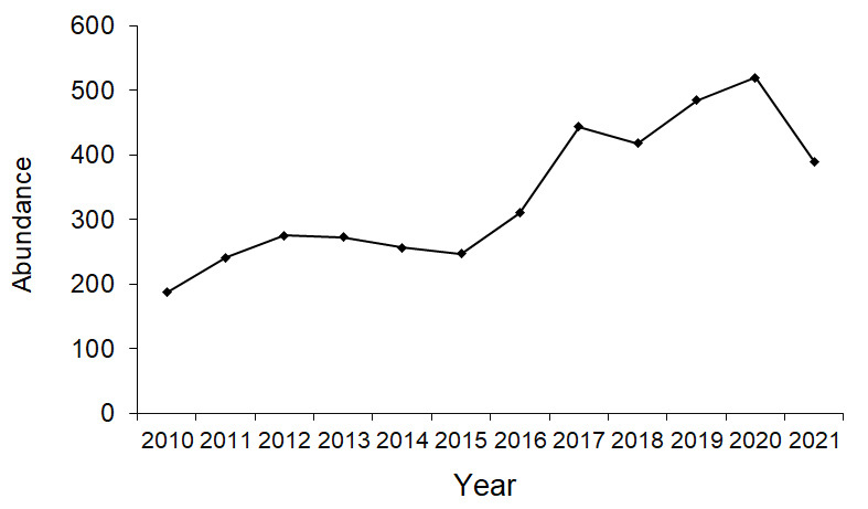 アオウミガメは増えている? アオウミガメは世界的に増加傾向にあります。日本でも様々な産卵地で母ガメもしくは産卵回数の増加が報告がされています。研究所では2009年から黒島海域にいるウミガメの数を調べていますが、この10年で200頭から400頭に増えています。