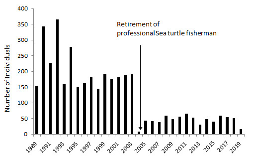 そもそもウミガメは捕獲して良いの? 日本ではアオウミガメは各都道府県レベルで規制がかかっています。海域において、ウミガメは積極的に食用とされた歴史があるため、現在も法的には魚と同じ漁獲物として扱われています。今でも、沖縄県や東京都では捕獲枠が設定され、許可を得れば食用として捕獲できます。例えば、沖縄県ではアオウミガメは約200頭の捕獲枠があります。しかし、八重山最後のウミガメ漁師が引退してからは上限に達していません。なお、砂浜に産卵に来る母ガメとその卵については、原則捕獲が禁止されています。 沖縄県におけるアオウミガメの漁獲統計(沖縄県水産課WebSiteより)。2004年に最後のウミガメ漁師が引退して以降、ほとんど漁獲されていない