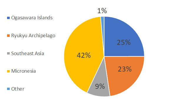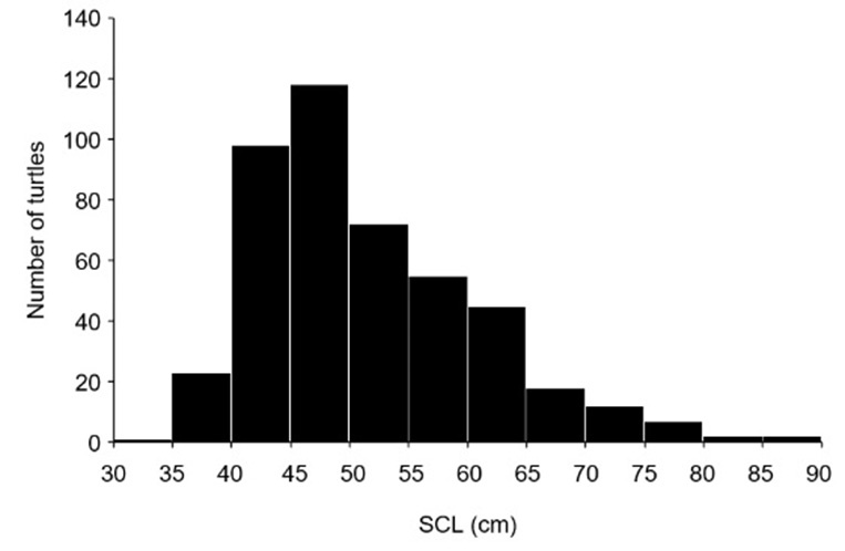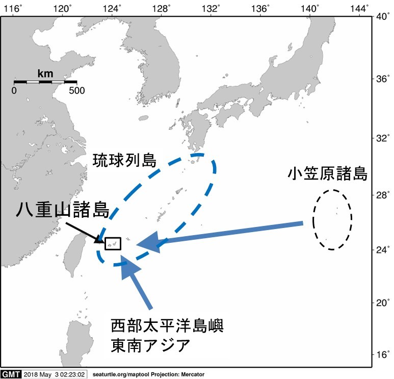 アオウミガメは何処から来るの? 日本はアオウミガメにとって餌を食べる場所です。このため、日本の沿岸で見られるアオウミガメは、未成熟のサイズが大半を占めています。この未成熟のアオウミガメは、日本生まれだけでなく、世界中からやってきます。特に沖縄県八重山諸島では、日本産と海外産の割合が同じぐらいです。この割合は北に行くほど日本産、特に小笠原生まれが多くなることが知られています。 黒島におけるアオウミガメの大きさ(甲らの長さ)。最小成熟サイズは80㎝。ほとんどが未成熟サイズである