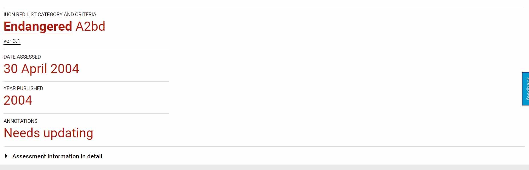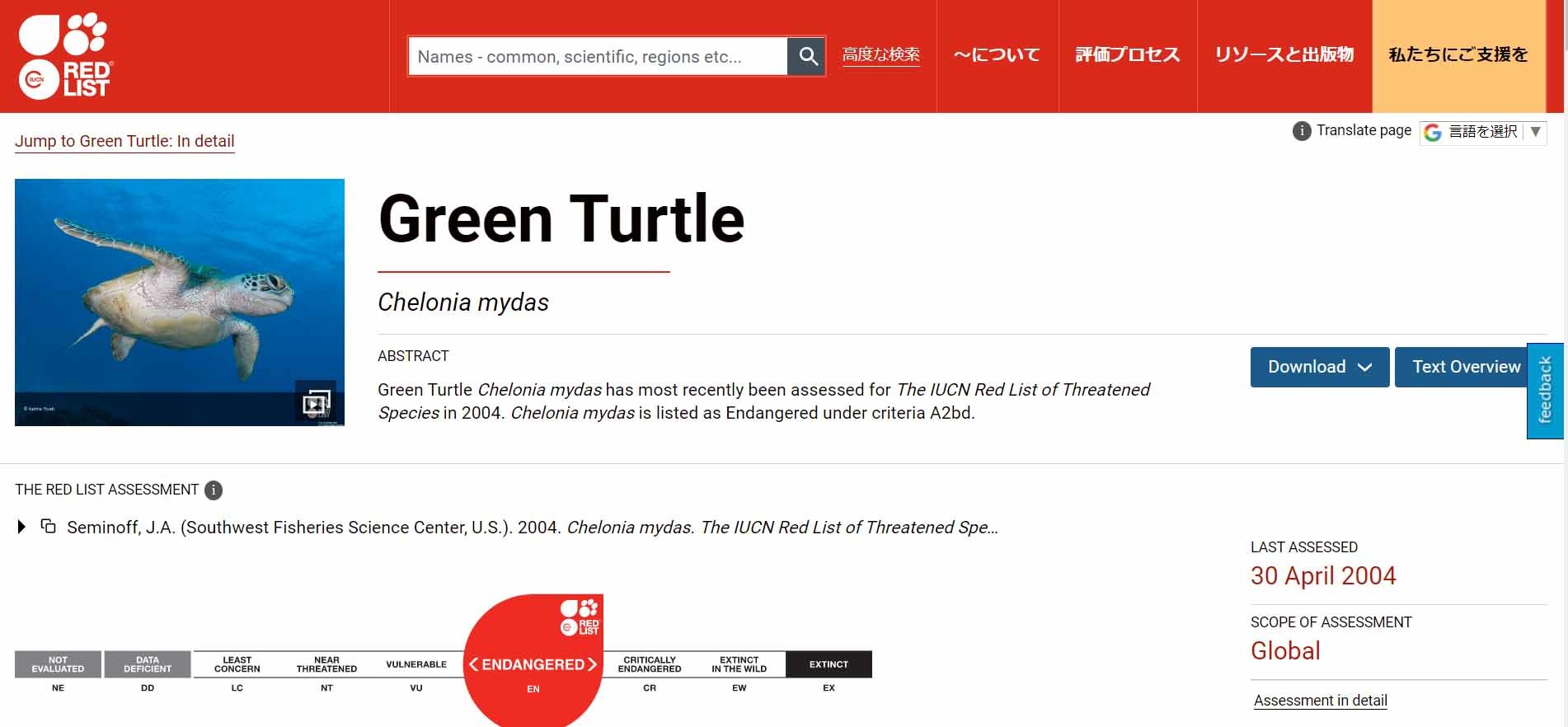 左:移動のイメージ図。 アオウミガメは絶滅に瀕していますか? アオウミガメは国際自然保護連合(IUCN)によって絶滅危惧種に指定されています。この評価は2004年の報告書に基づきますが、元データは90年代がほとんどです。つまり、現状が正確に反映されているとは言えません。このため、IUCNは「アオウミガメの評価は更新する必要がある」としています。なお、沖縄県の最新のレッドデータブック(2017年)ではアオウミガメは準絶滅危惧種、つまり絶滅危惧種とは評価されていません。 IUCNのWebサイトより抜粋。絶滅危惧種(Endangered)に指定されているが、左下を見ると、再評価が必要(Needs updating)と記載されている