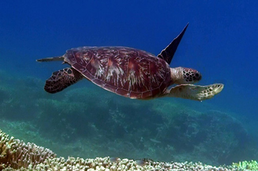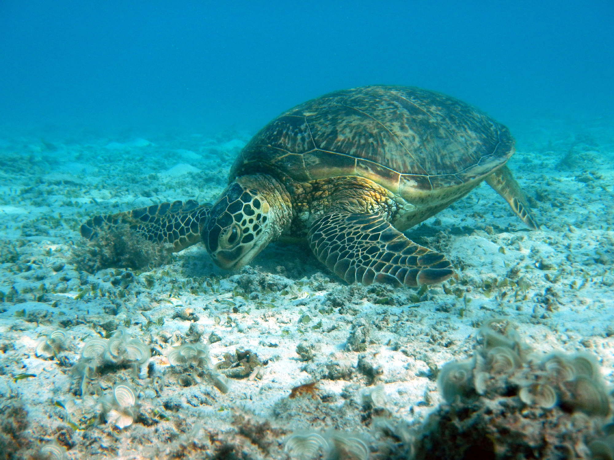 | アオウミガメとは 世界中の温帯から熱帯にかけて生息しています。沿岸性のウミガメでダイビングやシュノーケリングで観察できるウミガメは、ほとんどがアオウミガメです。沖縄県では、岸から観察できるところもたくさんあります。主食は海草や海藻です。また、地域によってはクラゲ等も食べています。日本では小笠原諸島と南西諸島で産卵します。海域では東北から八重山諸島まで見ることができます。