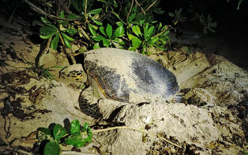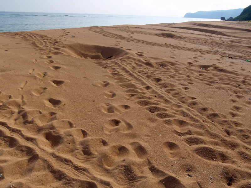 黒島研究所は、西の浜の他に西表島南岸にあるウブ浜とサザレ浜のモニタリングも実施しています。これらの浜は、八重山諸島でも屈指のアオウミガメの産卵地として知られています。産卵シーズンには、数メートルおきにウミガメの上陸痕跡がみられます。