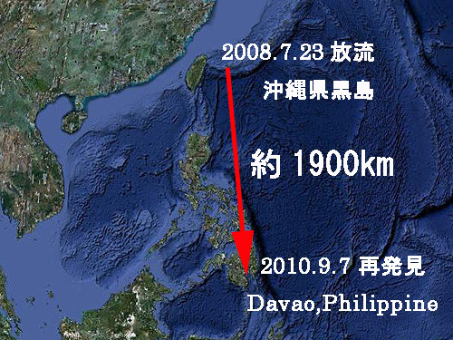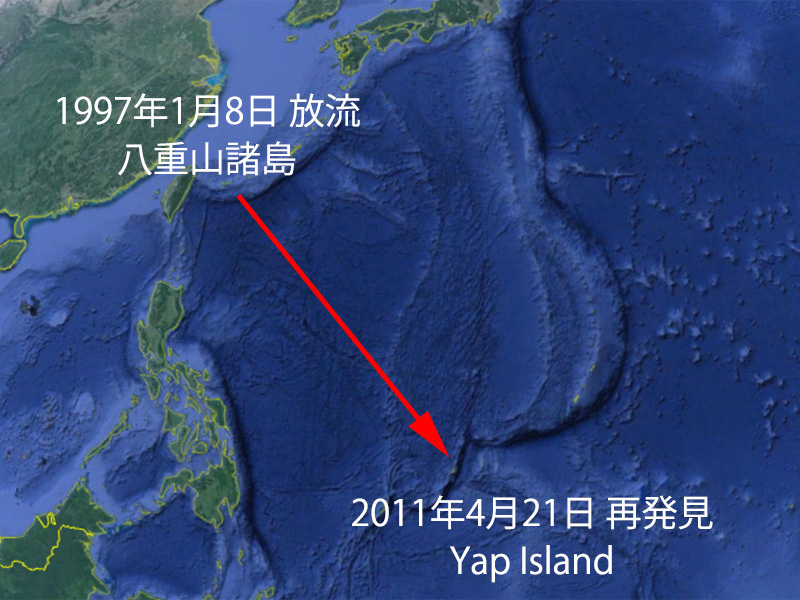 ウミガメに個体識別用の標識をつけて海へ放流します。次に見つかれば、ウミガメの成長や移動ルートが明らかになります。この調査によって、八重山諸島は未成熟のアオウミガメの餌場になっていること、アオウミガメは一年間およそ2㎝大きくなることがわかりました。また、八重山だけでなく、本州や海外でも再発見されました。