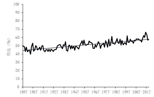 現在は砂浜に温度ロガーを設置して、砂中温度から性比の変化を調べています。そして、気温との相関を調べ、過去の性比を推定しています。図はメスの割合を%で示したものです。まだ十分な解析はできていませんが、この120年間に1割ほどメスの割合が増えたようです。