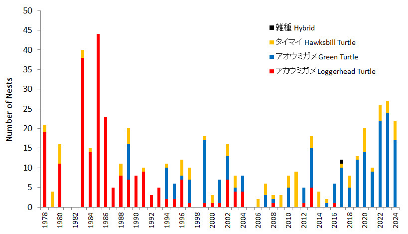 このグラフは西の浜におけるウミガメ類の産卵回数を示しています。1980年代までは、アカウミガメの産卵が多かったのですが、近年ではほとんど見られなくなりました。90年代からは、アオウミガメの産卵が確認されるようになりました。タイマイは同じぐらいの数が継続的に確認されています。このような種ごとの変化は、温暖化によって産卵地が変わった、個体数の増減とも考えられますが、はっきりとはわかりません。しかし、八重山諸島においてアカウミガメが減り、アオウミガメが増えた、という事実を明らかにしています。