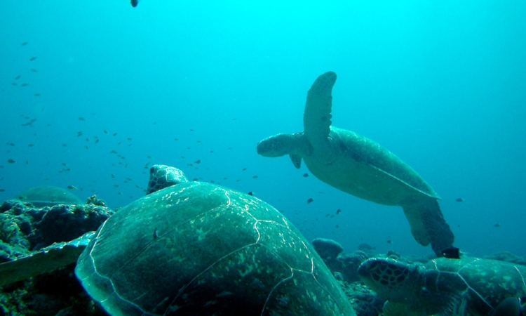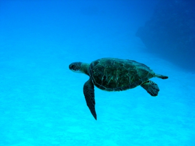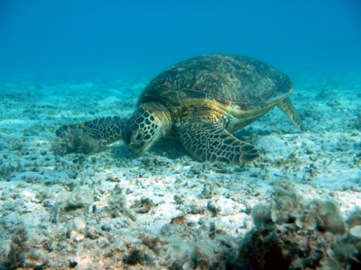 アオウミガメアオウミガメ:沿岸に住んでいて、一番ダイビングで出会える種類です。海藻・海草を食べるベジタリアンですが、クラゲを食べることもあります。”アオ”ウミガメと呼ばれますが、体は赤、茶色、黒とさまざまです。近年では、世界的に増えています。大人になるとアカよりも少し大きく90-110㎝になります。