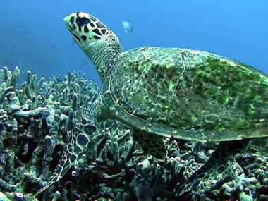 タイマイタイマイ:サンゴ礁の海に多く生息します。サンゴの隙間にある餌を食べるために、くちばしが鳥のように長く尖った形になりました。奄美諸島以南では、ダイビングで見れますが、アオウミガメよりは珍しいようです。甲らはべっ甲細工に利用されます。大人は甲らが70-90㎝ほどです。