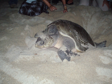 ウミガメは陸に住んでいたカメが海へ進出したものです。海中で早く泳ぐために、手はヒレのようになり、甲らは水の抵抗を受け難い流線形になりました。甲らの骨は隙間が多くなり軽くなりました。この進化のためにウミガメはとても早く泳げます。しかし、卵は海の中では死んでしまうので、母ガメは産卵のために砂浜に上陸するのです。