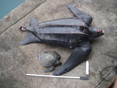 オサガメオサガメ:外洋に生活し、クラゲを食べます。産卵地は日本よりも南の熱帯地域にありますが、過去に一度だけ奄美で産卵したことがあります。世界的に絶滅が心配されている種類です。マグロのように泳ぎ続け、他のウミガメよりも皮膚が弱いために、水族館での飼育は成功していません。体は他のウミガメと違い、厚い皮状になっています。世界最大のウミガメで、大人になると130-170㎝になります。