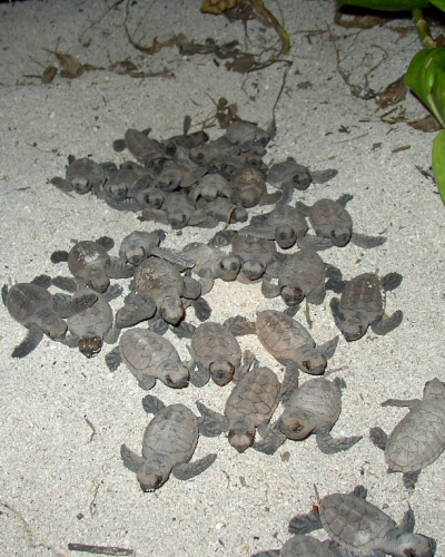 砂の中でふ化した子ガメは徐々に砂の表面に移動します。そして、夜になると一斉に脱出します。その後、一斉脱出に遅れた個体が、数日にわたり少しずつ出てくるパターンが多いです。砂中の子ガメは、砂の温度が低下することで、夜であることを察知します。このため、大雨が降ると、まだ明るい時間帯でも脱出することがあります。脱出した子ガメは光をたよりに海の方向へ向かいます。人の目からみれば夜の海は真っ暗ですが、子ガメは紫外線が見えるため、海の方向が明るく見えると考えられています。