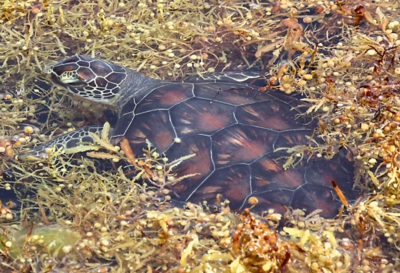 流れもいるウミガメ。Witherington et al.,2012より ふ化した子ガメは、約2日間、餌も食べずにひたすら沖に向かって泳ぎ続けます。これはフレンジーと呼ばれる状態で、子ガメが外洋に移動するために必要な行動です。その後、40㎝になると沿岸生活を始めます。しかし、甲らの長さ30㎝以下のウミガメは何処にいるのかわからず、Lost ageと呼ばれる空白期間でした。2012年になってフロリダ半島周辺では外洋に移動した子ガメは流れ藻とともに生活していることが報告され、ようやく外洋生活の一端がわかりました。国内でも座間味島で流れもついたウミガメの観察例が1・2例の確認例がありますが、未だに、この外洋生活期中のウミガメに出会うことは困難で、その生活は謎に包まれています。