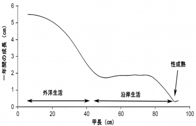 満潮になると水深1~3mほどの浅場で海草と海藻を食べます。餌を食べる時間は特に朝と夕方に盛んになります。生活する範囲は狭く、1~3 ㎞程度のようです。このような一日のサイクルを繰り返し、一年間に2㎝ほど成長します。そして甲長90㎝ほどになると大人になり、それからは、ほとんど成長しません。